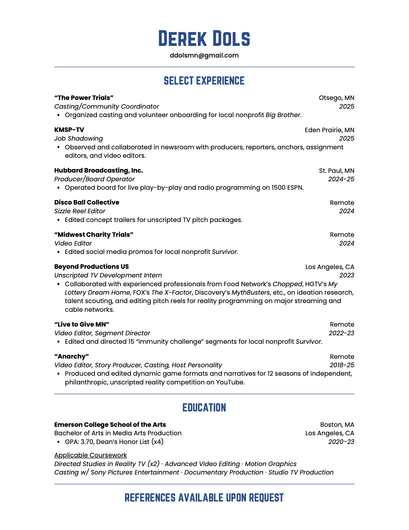 Additionally my recent roles as a 1500 ESPN Producer / Board Operator at Hubbard Broadcasting, and Casting Coordinator / Video Editor / Segment Director for nonprofits Midwest Charity Trials and Live to Give MN, have provided much supplemental experience in honing these production skills.